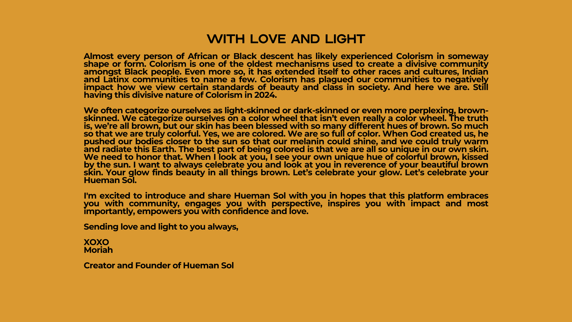 We often categorize ourselves as light-skinned or dark-skinned or even more perplexing, brown-skinned. We categorize ourselves on a color wheel that isn’t even really a color wheel. The truth is, we’re all brown, but our skin has been blessed with so many different hues of brown. Hueman Sol is committed to positively disrupting the narrative about skin tone so that women of color can proudly embrace their natural hue. Let’s change the narrative of what society and the history of white supremacy has created. Your skin very well may be lighter than your other melanin friends or it may be darker than those around, but it should not be the defining element on the scale of how beautiful you are. Instead, your unique hue should be the jewel that highlights your beauty, both inside and out. Let’s change the narrative and create our own color wheel together.