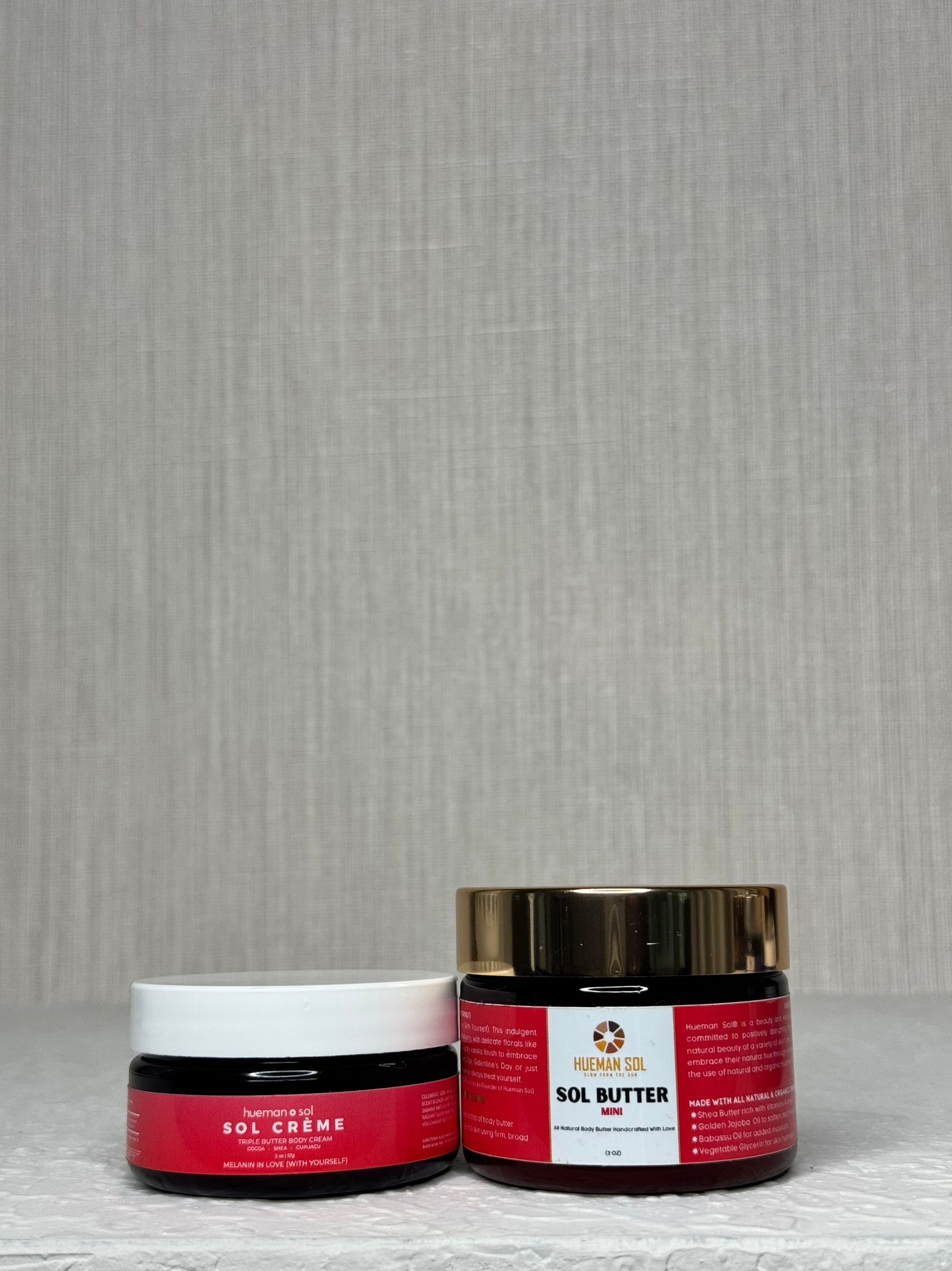 Layer your love with The Radiance Ritual — a luxurious bundle featuring Sol Butter Mini (3oz) and Sol Crème Mini (2oz). Together, they create the ultimate self-care ritual for deeply hydrated, velvety-soft, radiant skin.