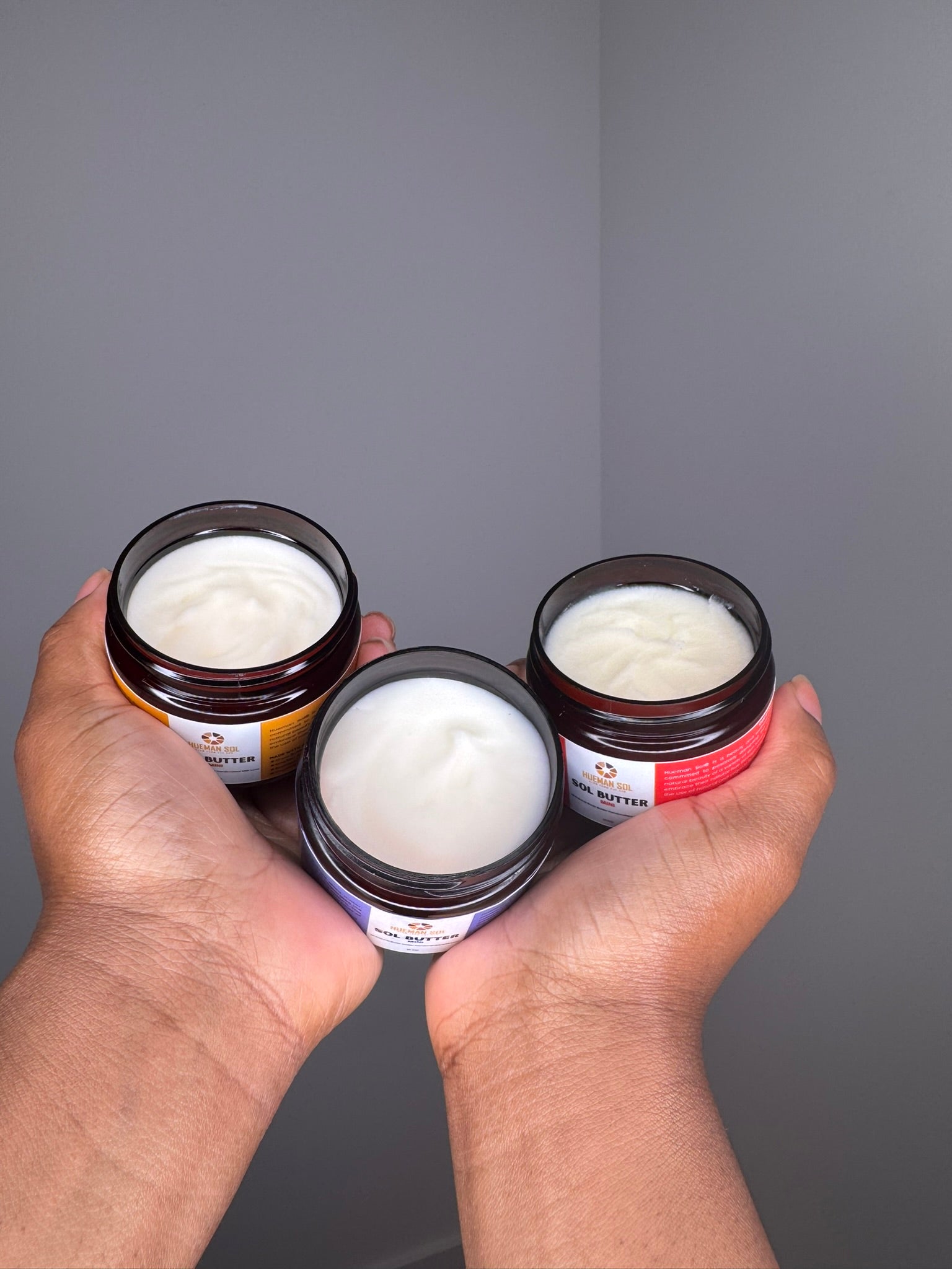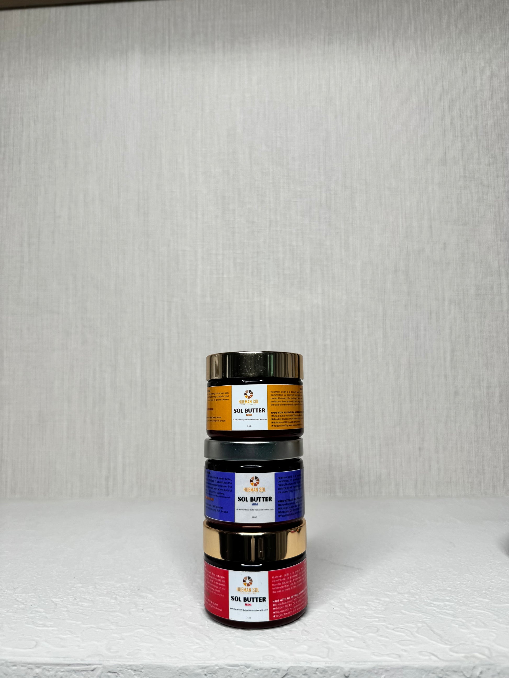 OUR FLAGSHIP PRODUCT: Sol Butter is a nourishing body butter that will moisturize your skin to leave a natural glow that highlights your beautiful melanin hue, enriched with all-natural butters and oils sourced from the earth.