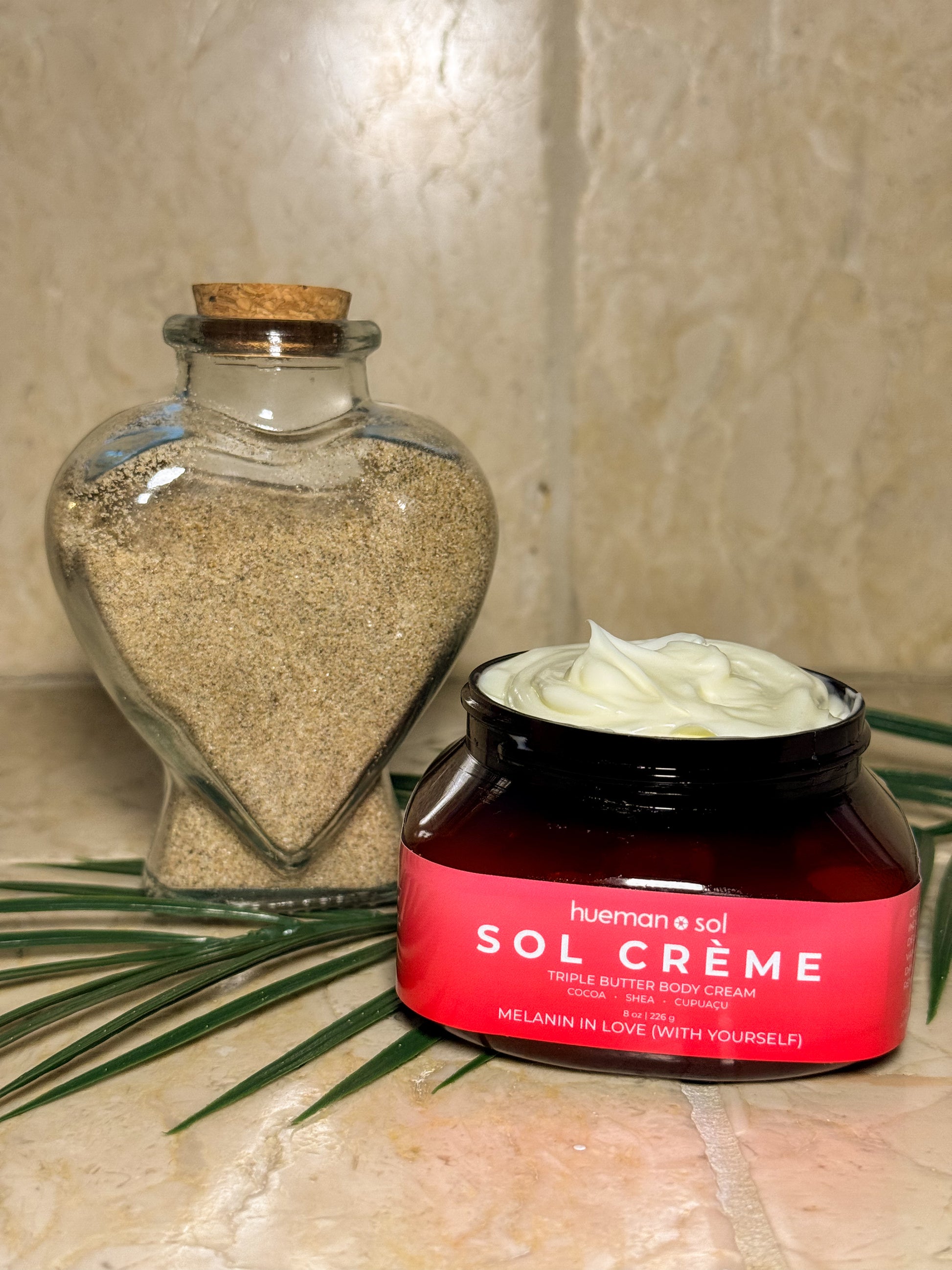 Meet Sol Crème—our triple-butter body cream made to melt right into your melanin. Crafted with cocoa butter, shea butter, and cupuaçu butter, this luxuriously soft formula delivers deep moisture with a lighter feel—perfect for everyday radiance, especially in warmer months.