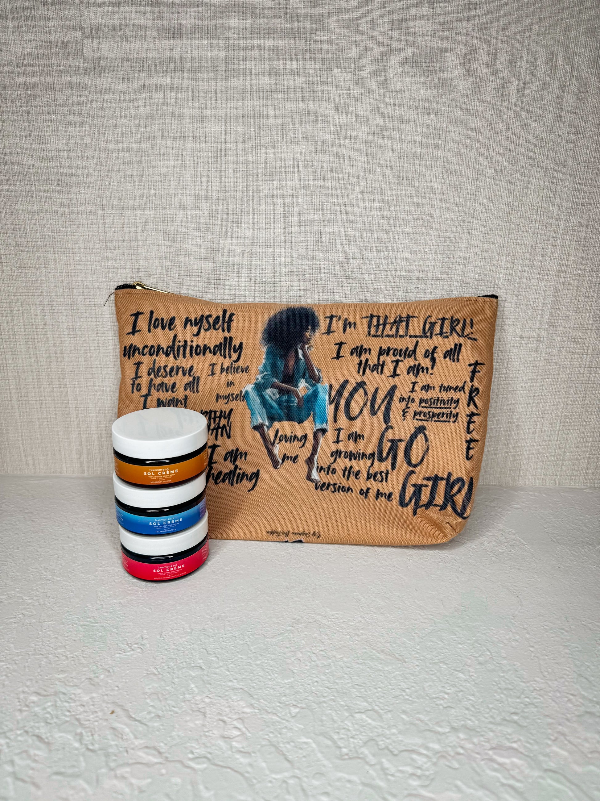 Includes FREE gift with purchase, the Art By Jaz Affirmations travel bag, which can be used as a travel bag, makeup bag or a purse.